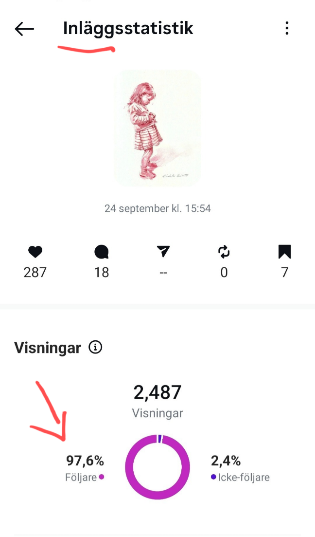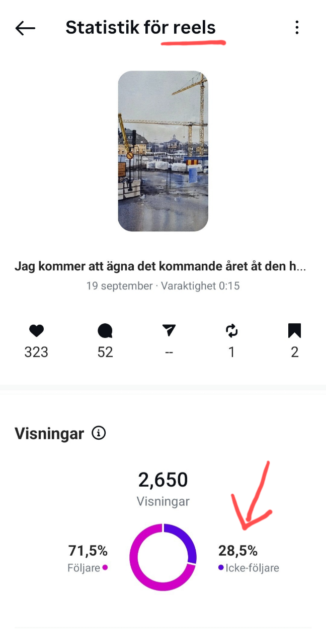 Det här är ett inlägg jag lade upp för ett tag sedan. Ett inlägg är alltså inte en reel, utan en bild du åstadkommer genom att välja alternativet “publicera” i Instagramappen. De visas nästan uteslutande för dina befintliga följare. I det här fallet är 97,6% av dem som sett bilden personer som redan följer mig. Spridningen till nya, potentiella följare är mycket liten (2,4%).