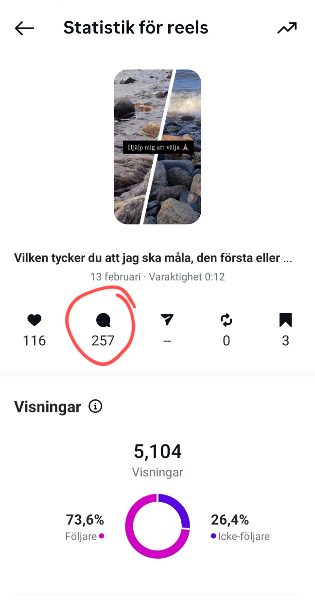 Tips: Om du vill kunna hålla koll på sådan här statistik på ditt Instagramkonto ska du ändra i inställningarna från privat- till kreatörskonto eller företagskonto. Då kan du se vilket resultat varje inlägg/reel ger och börja experimentera med olika typer av innehåll som ger den effekt du är ute efter.