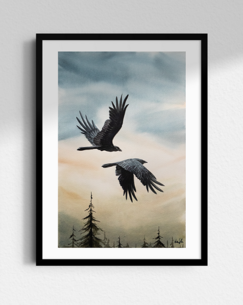 Mäktigt majestätiska korpar i Louise Stigells akvarell “Gryning”…