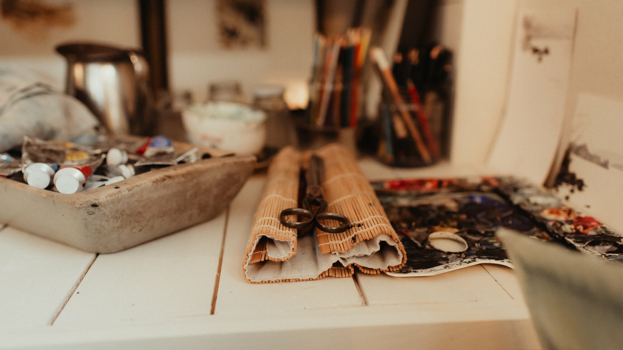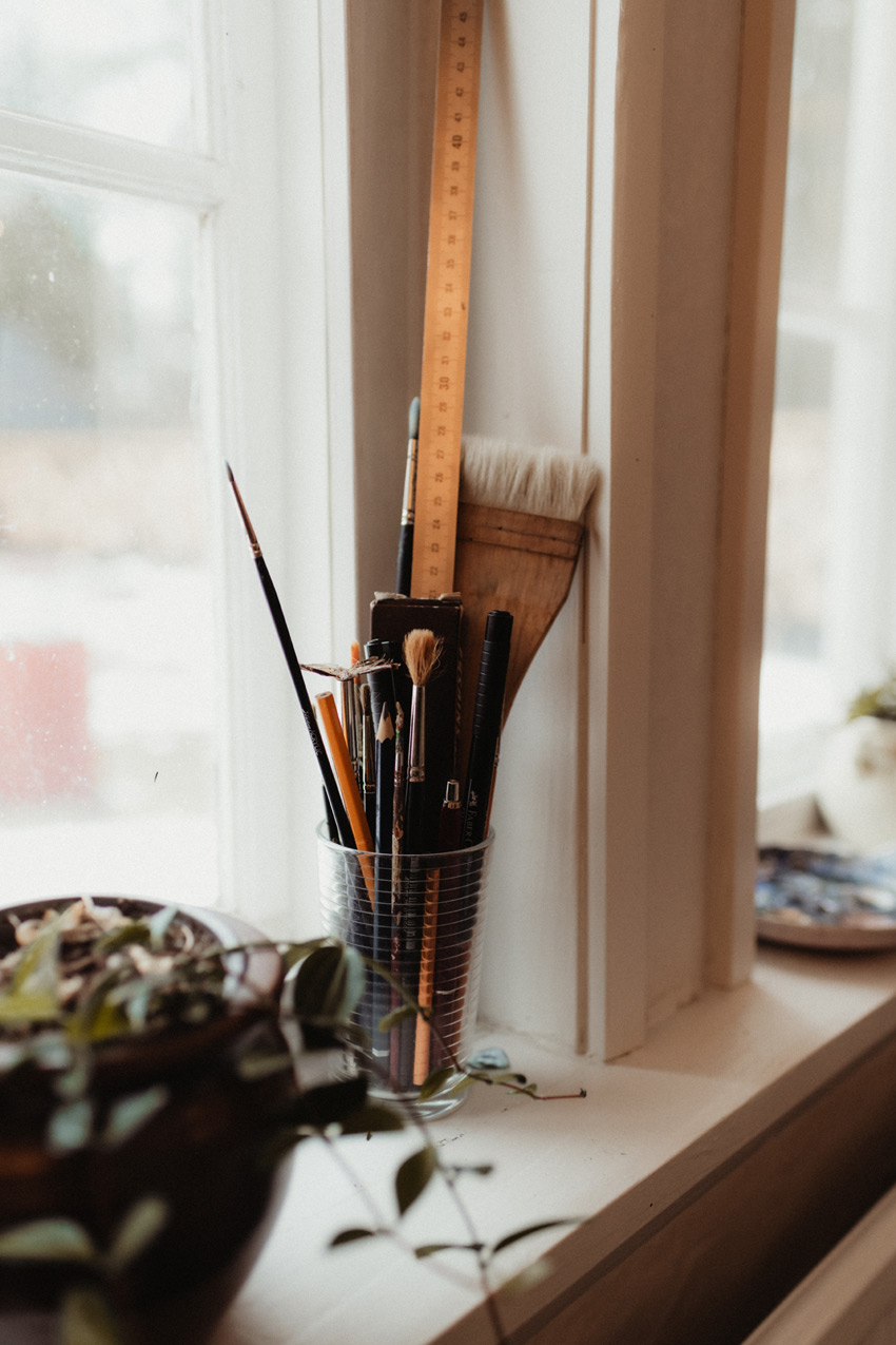 Jag valde bort plastlådor med prydliga fack och öste istället ner mina färgtuber i ett trätråg. I mina ögon skönt att se på, som en godisskål av möjligheter. Material som trä, glas, keramik och naturliga textilier ger mig arbetsro.