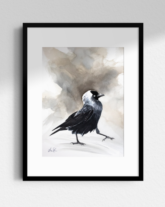 … och en kaja med självförtroende i steget och illavarslande uppsyn i akvarellen “Här kommer jag”.