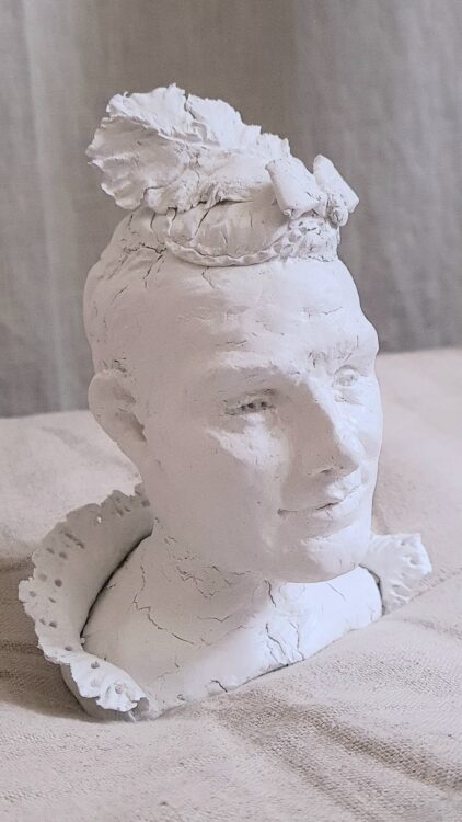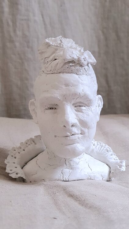 Det här är en byst av av Erik Andersson, iklädd Marie Antoinettes fjäderprydda hätta och kråskrage, utförd i min 8-årings leklera. Jag kallar den “Låt Dem Äta Drömmar” och ska donera den som gåva till kommunledningen i Täby. Alldeles gratis.