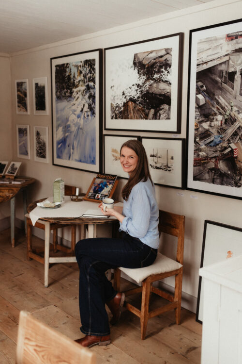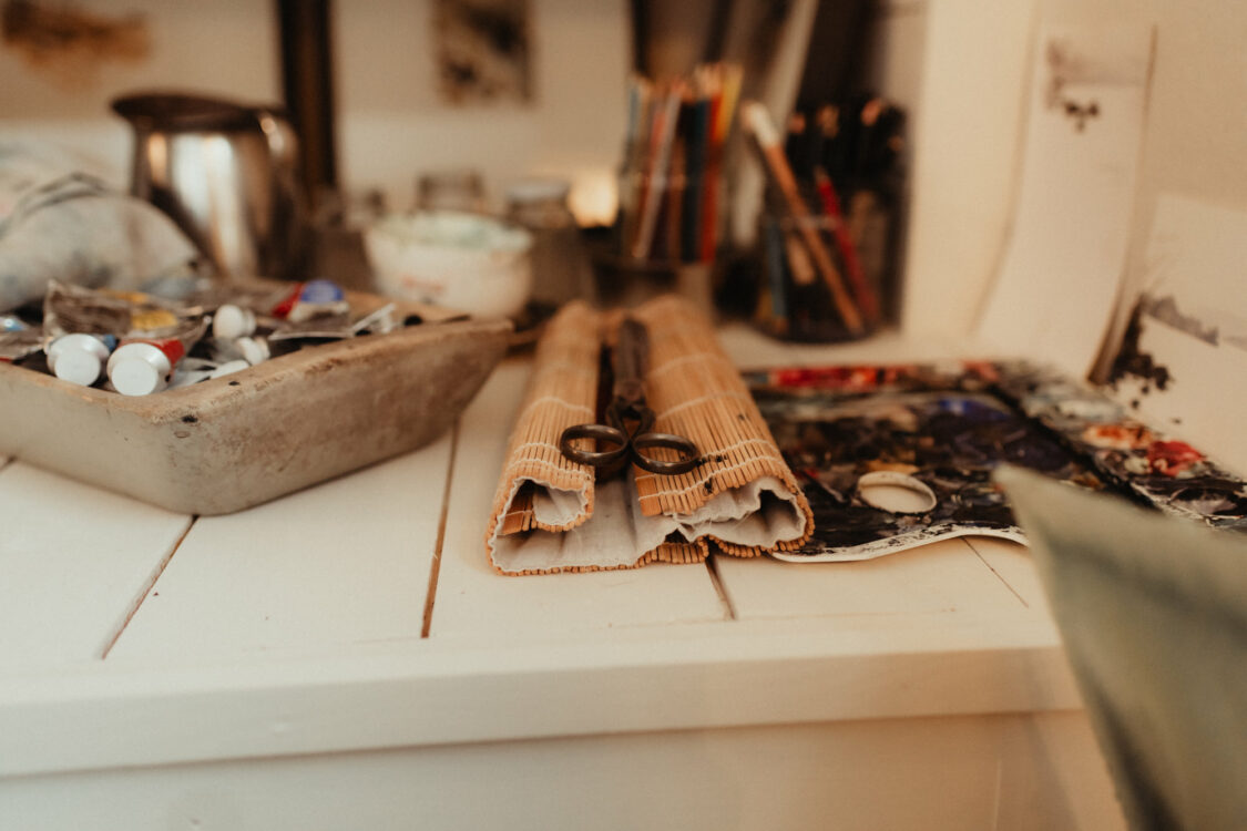 Eftersom jag i grund och botten (som du kanske anat vid det här laget) är en ganska rörig person, har jag tagit med mig rutinmetoden till ateljén. Den dagliga ritualen är enkel och effektiv: jag tänder en brasa och funderar över dagens arbetsuppgifter medan elden tar sig. Stänger kaminluckan, slår igång en podd och målar fram till lunch. Resten av dagen kan få bli mer ostrukturerad; på det här sättet har jag alltid fått det viktigaste gjort först. Och jag slipper slösa energi på att fatta beslut om hur förmiddagen ska se ut.