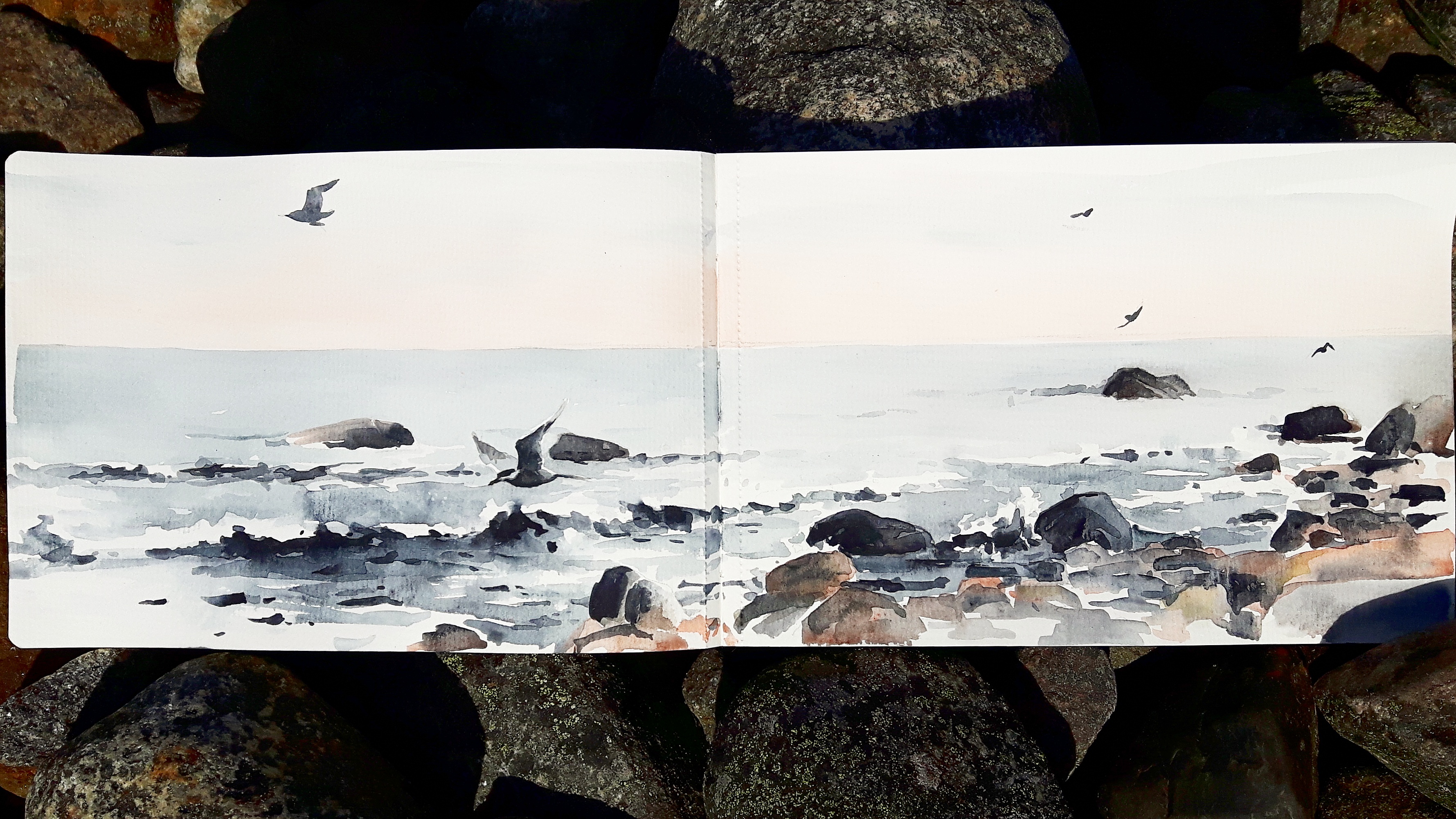 Först skissar jag med lätt hand och en hård blyertspenna upp de olika delarna av motivet som jag vill ha med i min bild. Jag flyttar ner horisontlinjen litegrann och är noggrann med att få öarna på en helt rak linje; det syns direkt om en horisont är svajig. Jag flyttar lite på personerna i bilden och försöker ge dem rätt proportioner. I övrigt är det inte så noga att varje sten hamnar rätt – du behöver inte göra en exakt avbildning av förlagan. I ett kommande inlägg kommer jag skriva mer om skissande och komposition.