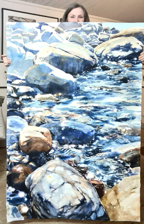 En akvarellmålning kan gå snabbt att göra, men de kan också ta mycket tid. Det beror på konstnären, motivet och tillvägagångssättet. Jag målar på många olika sätt – ibland litet och snabbt. Men allra helst målar jag stort. Mina största målningar är drygt 1×2 meter stora och de tar många veckor att färdigställa.