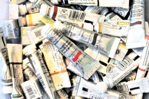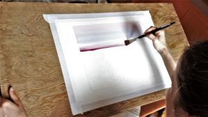 När jag målar bildas det en lång droppe med våt färg i underkant av den målade ytan. Så länge du har denna droppe “lever” målningen och du kan fortsätta fylla på nedåt med nästa penseldrag. Jag sköljer penseln i rent vatten mellan varje färgbyte.