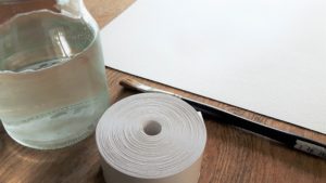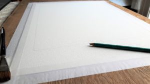 1. Ta fram ett papper och en skiva att spänna upp papperet på. Plywood är ett lämpligt material, eller något annat som håller formen när det blir blött. Plexiglas, tjock foamboard, lackad masonit. I många år använde jag en gammal skjutlucka från en kasserad bokhylla – allt som är plant och tål vatten duger.