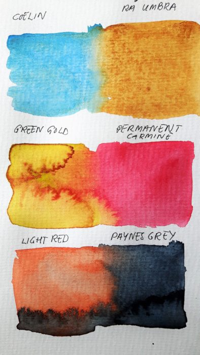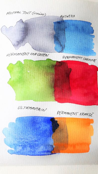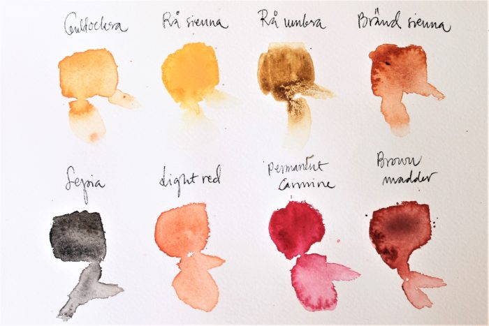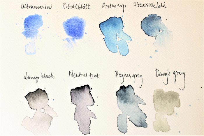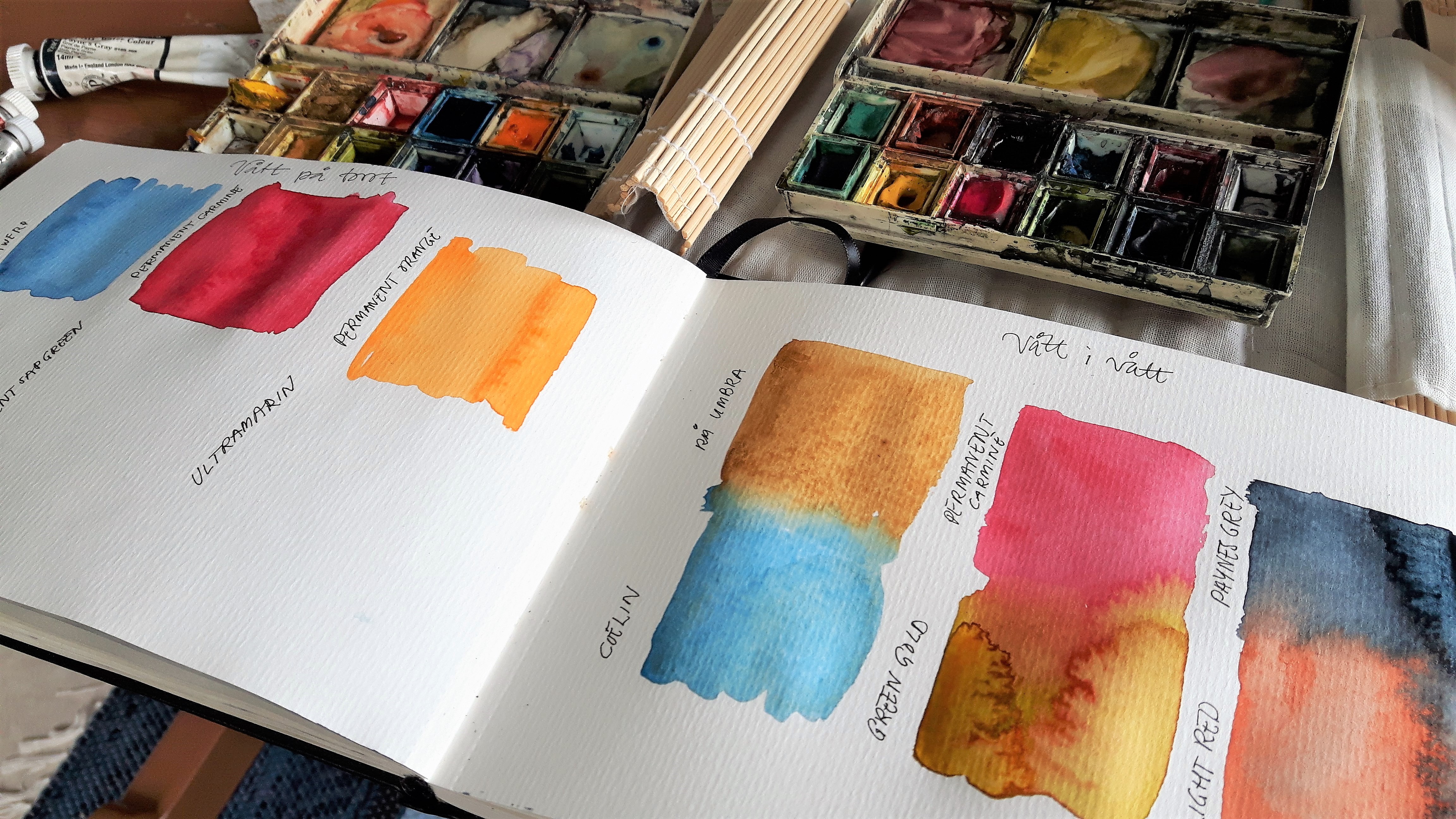 Har dina tvåfärgade vått i vått-fläckar torkat nu? Blev de vackra, intressanta? Förstärktes eller dämpades de olika färgegenskaperna i dina olika kombinationer? (I akvarellskolan del två kan du läsa mer om pigmentens egenskaper).