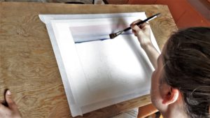 För att få till jämna övergångar mellan de blå och rosa nyanserna, lutar jag min skiva medan jag målar. Jag kommer måla himmel och hav uppifrån och ner, med horisontella drag med penseln.