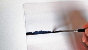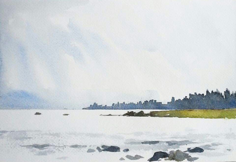 När det första färgskiktet är helt torrt är det dags att måla resten av motivet. Nu målar vi vått på torrt. Jag målar landtungan vid horisonten med paynes grey – här med ganska mycket pigment och mindre vatten än tidigare, så att färgvalören blir lagom mörk. Akvarellfärg blir ljusare när den torkar, så det är oftast inget problem om den ser för mörk ut medan du målar.