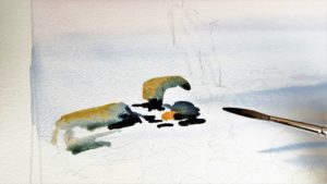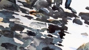 Jag målar stenarna vått i vått med de två färgerna. De får flyta ihop ganska fritt, men jag försöker genomgående lägga den råa umbran på stenarnas vänstra sida och paynes grey på den högra, eftersom ljuset i bilden kommer från vänster.