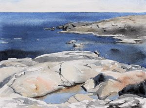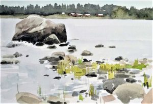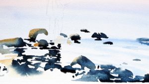 Stenarna i förgrunden målar jag med paynes grey och rå umbra. Ofta tycker jag att det blir bra att begränsa antalet färger i en bild. Det kan vara viktigare att på så sätt få en bild att hänga ihop, än att få fram varje exakt nyans du ser i verkligheten eller på fotot du använder som förlaga. Därför får paynes gray återkomma här, även om stenarna på fotoförlagan är mindre blå än vad den är. Den råa umbran tycker jag funkar bra att måla stenarna med, eftersom den granulerar fint och därigenom hjälper till att ge intryck av sträv stenyta.