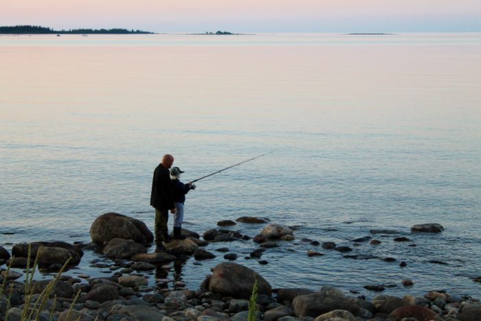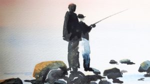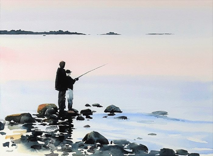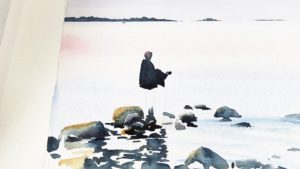 Jag använder även neutral tint till att markera ut de mörkaste skuggorna på och runt stenarna. Fiskarpojkens byxor målar jag med rent vatten och sedan låter jag en droppe paynes grey klättra upp från stövlarna.