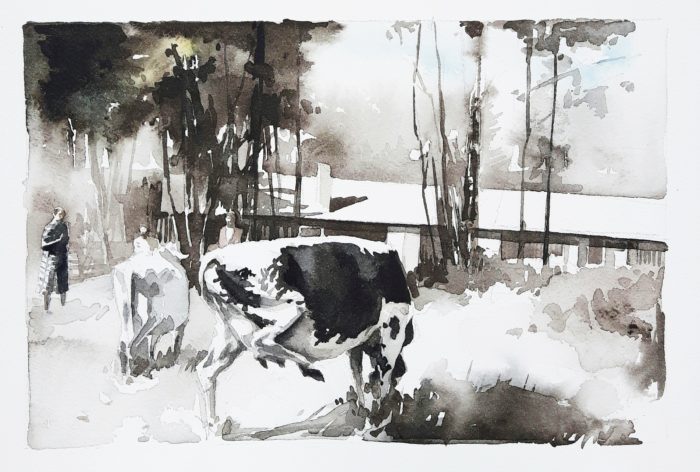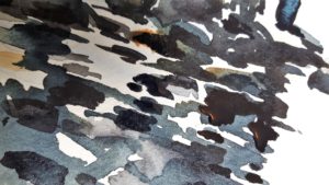 Jag målar ganska flödigt, det vill säga med mycket vatten och pigment. Jag vill att stenarna ska “måla sig själva”, genom att pigmenten får skapa blomningar och kantbitningar. Här och där sparar jag ut konturer av stenar som jag lämnar omålade – de får ta form i nästa steg.