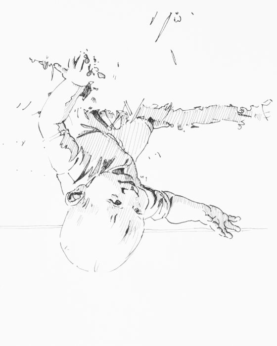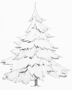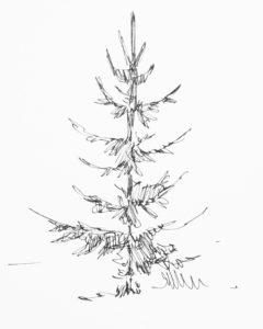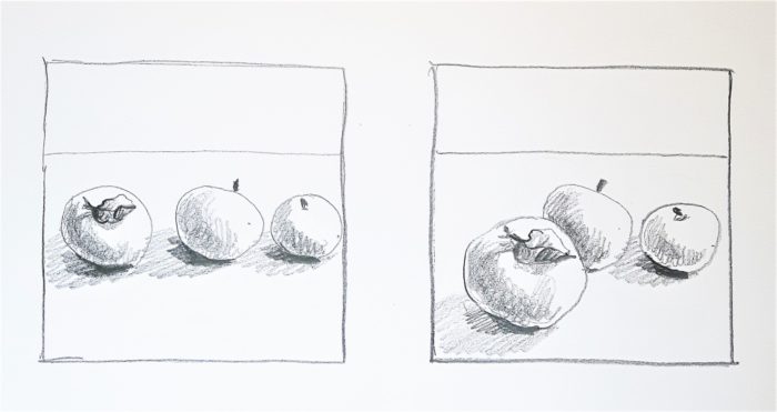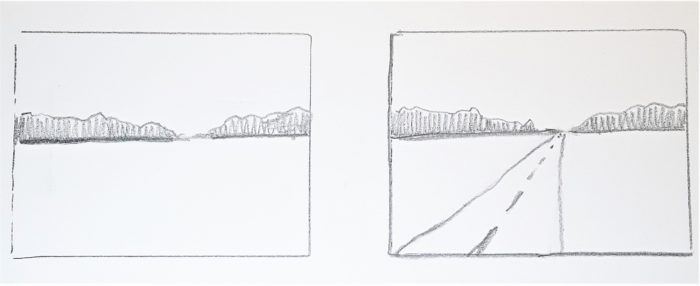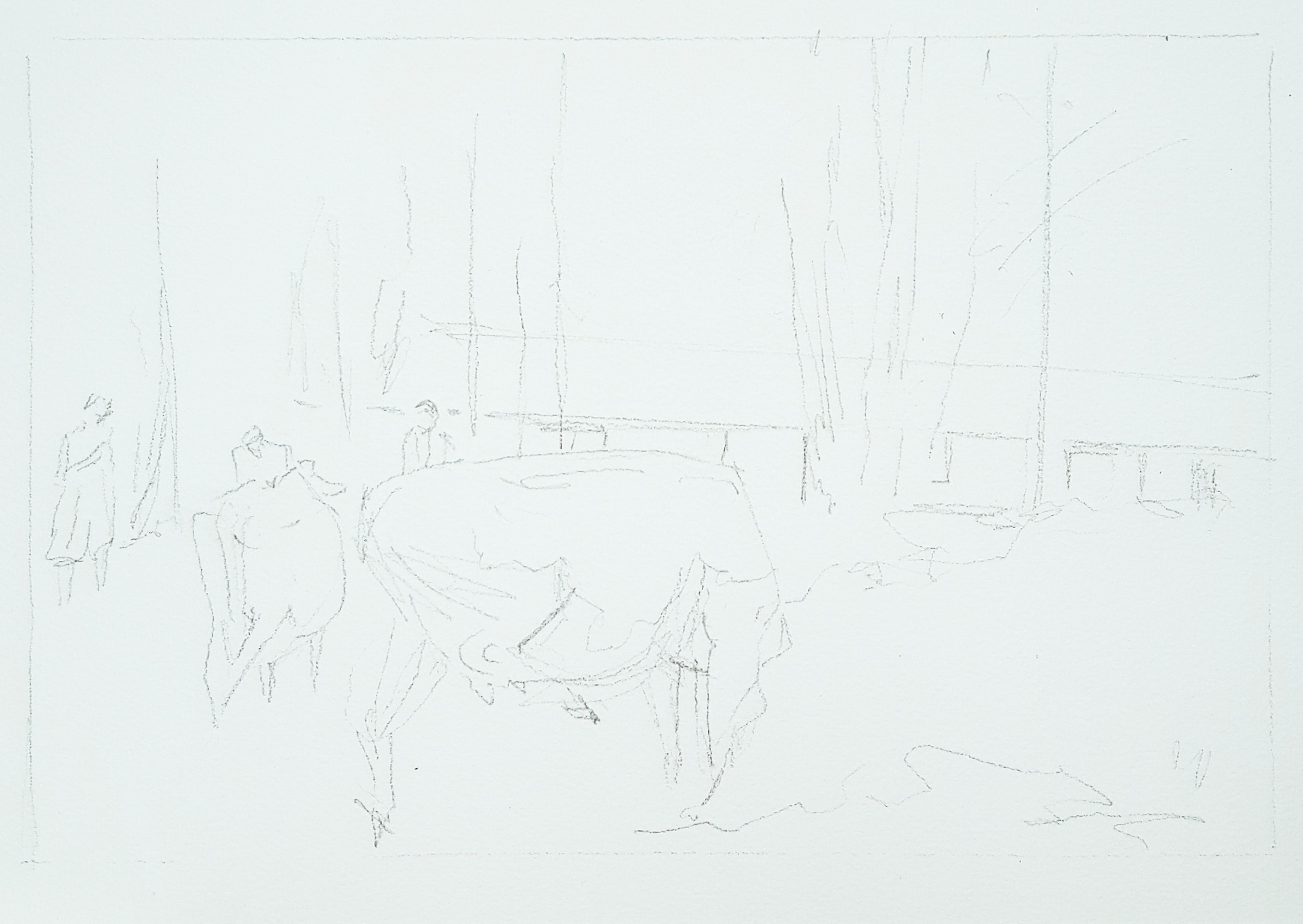 Först skissar jag med lätt hand och en hård blyertspenna upp de olika delarna av motivet som jag vill ha med i min bild. Jag flyttar ner horisontlinjen litegrann och är noggrann med att få öarna på en helt rak linje; det syns direkt om en horisont är svajig. Jag flyttar lite på personerna i bilden och försöker ge dem rätt proportioner. I övrigt är det inte så noga att varje sten hamnar rätt – du behöver inte göra en exakt avbildning av förlagan. I ett kommande inlägg kommer jag skriva mer om skissande och komposition.