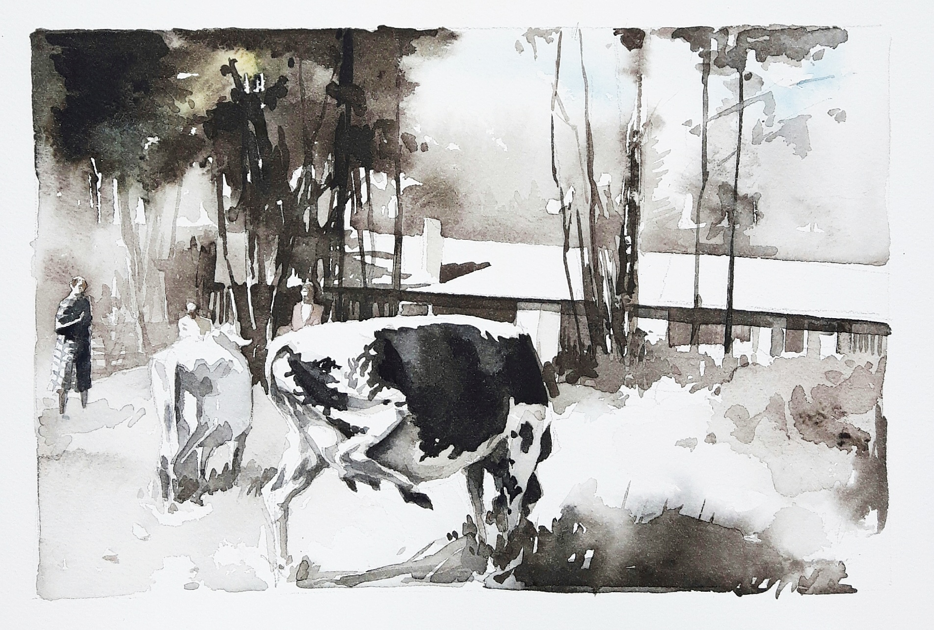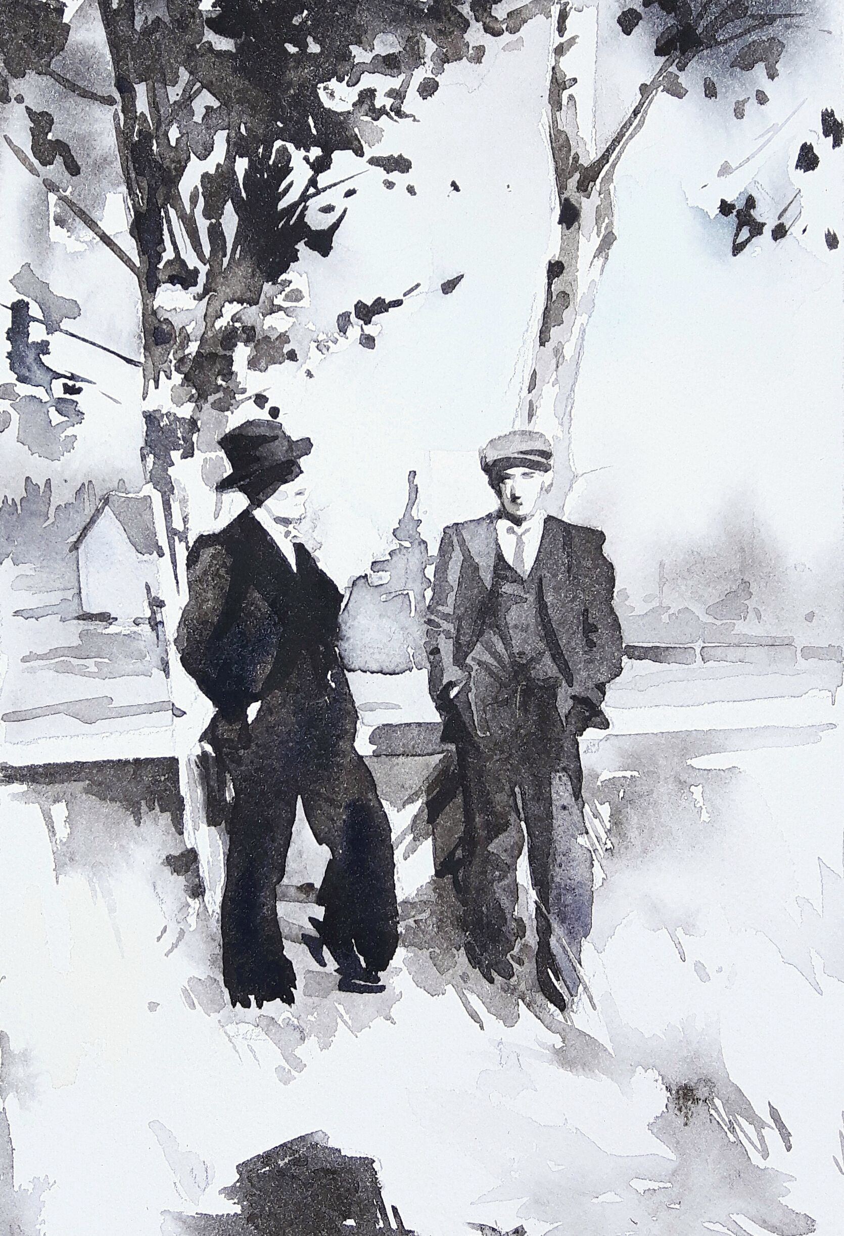 Bildens huvudpersoner målar jag fram med paynes grey spetsat med lite av den svarta färgen neutral tint.