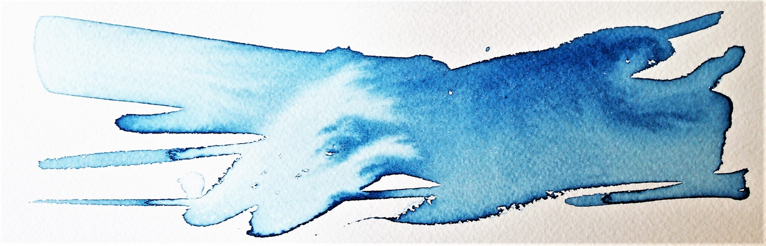 Medan färgen ännu är våt tar jag en mindre pensel med lite mer koncentrerad ultramarin, det vill säga mindre vatten och mer pigment, och drar några svep som ska antyda vågrörelser i vattnet. Om du har för mycket vatten i penseln vid det här momentet kommer det att uppstå blomningar allteftersom papperet torkar.