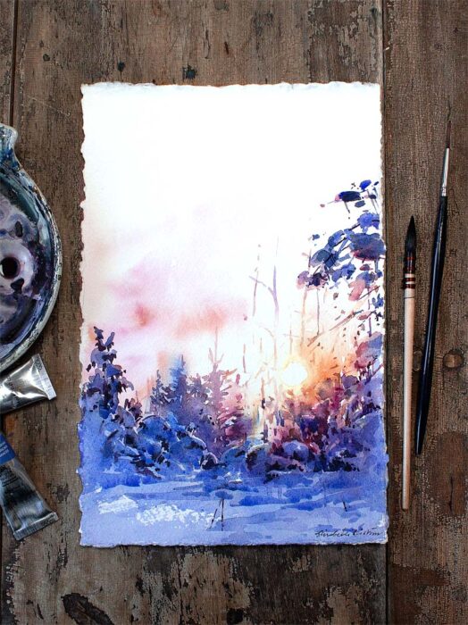 Först en skiss och ett tunt lager, vått i vått, för att sätta en grundton i bilden.