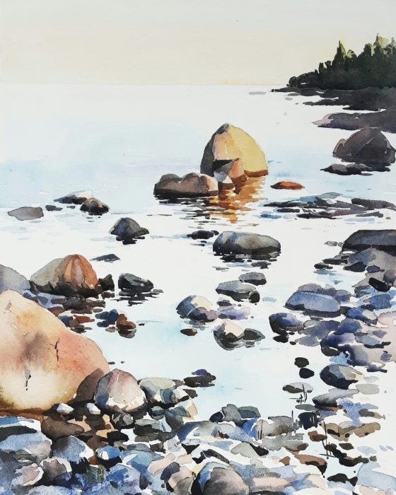 Stenarna i förgrunden målar jag med paynes grey och rå umbra. Ofta tycker jag att det blir bra att begränsa antalet färger i en bild. Det kan vara viktigare att på så sätt få en bild att hänga ihop, än att få fram varje exakt nyans du ser i verkligheten eller på fotot du använder som förlaga. Därför får paynes gray återkomma här, även om stenarna på fotoförlagan är mindre blå än vad den är. Den råa umbran tycker jag funkar bra att måla stenarna med, eftersom den granulerar fint och därigenom hjälper till att ge intryck av sträv stenyta.