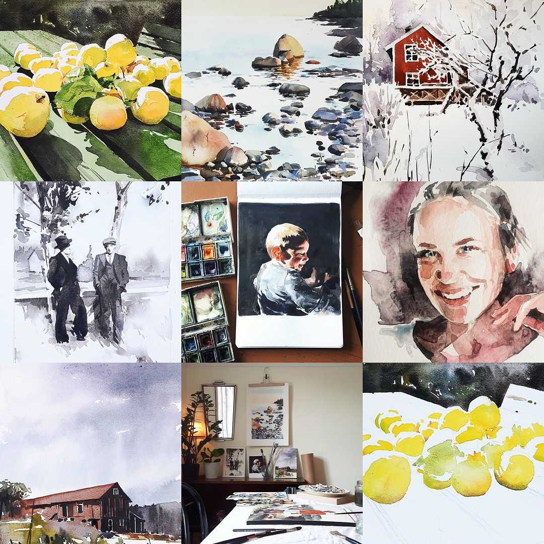 Jag känner mig också otillräcklig inför dem, er, dig som följer mig på till exempel instagram. Känslan följer mig in i ateljén. Jag kan sitta djupt försjunken i en målning och plötsligt ryckas upp till ytan av tanken “borde jag instagramma det här?” Det dödar omedelbart den känsla av magi jag är beroende av för att göra ett bra arbete. Jag tappar fokus och flow. Ibland för någon minut, ibland för resten av dagen. Vad det gör med mig på lång sikt vet jag inte. Ännu.