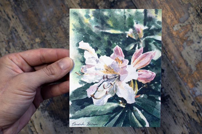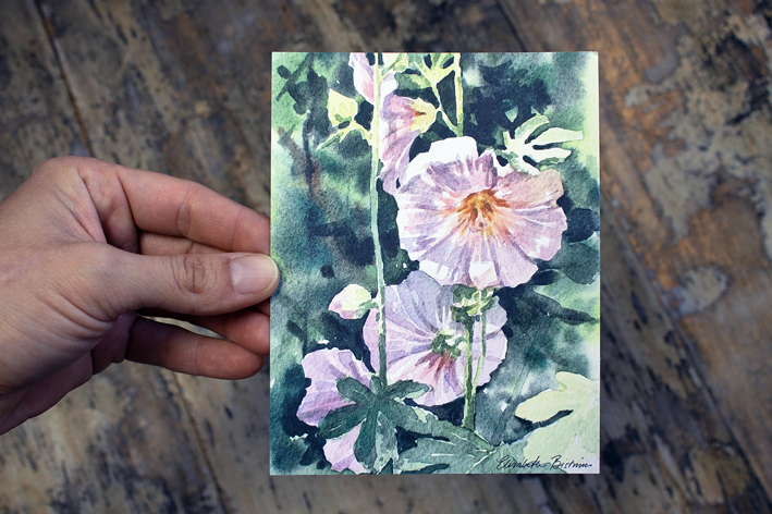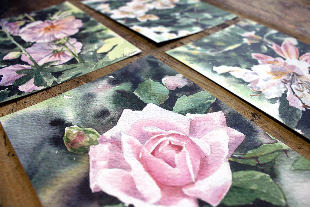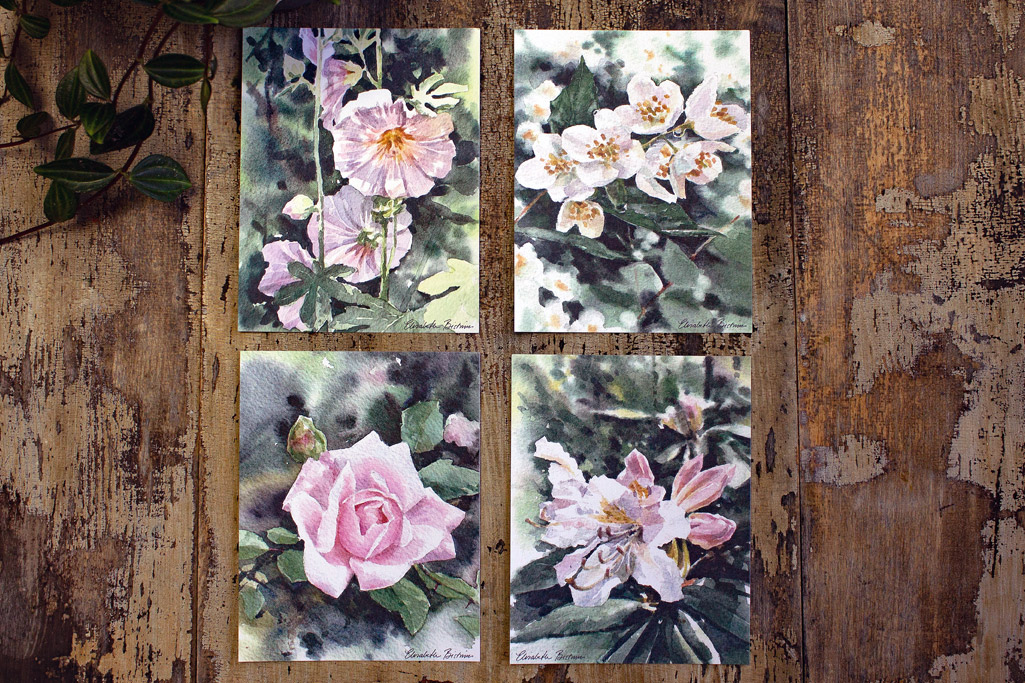 Vykort i fyrpack med motiven “En nyutsprungen skär”, “Doft av sommar”, “Dansande ljus” och “Försommarflor”, utifrån akvareller av Elisabeth Biström.