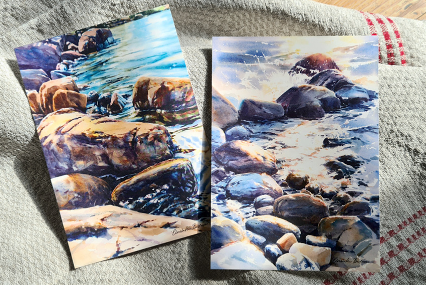 Två vykort med havsmotiv utifrån originalakvarellerna “Vila här en stund” och “Vakna i ljus” av Elisabeth Biström.