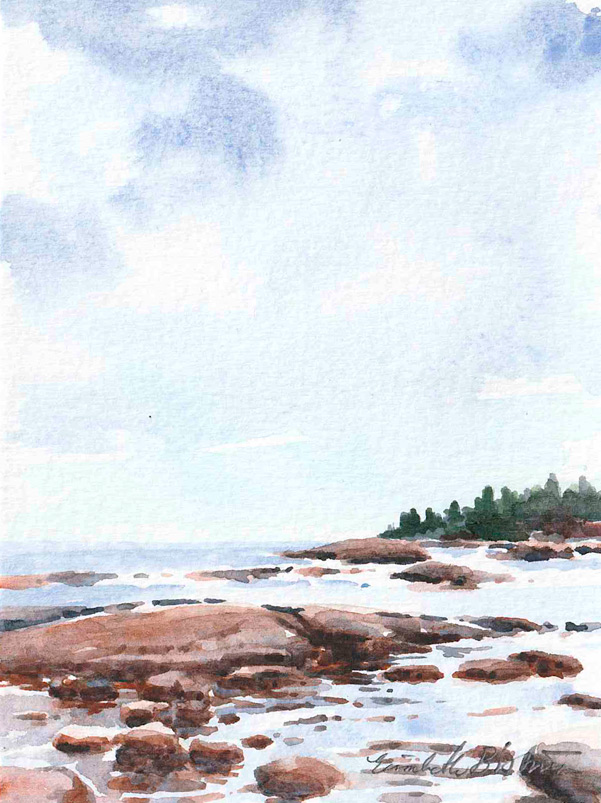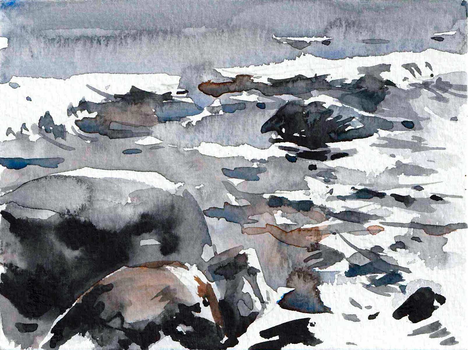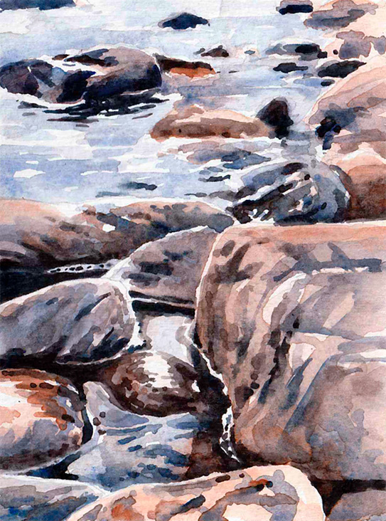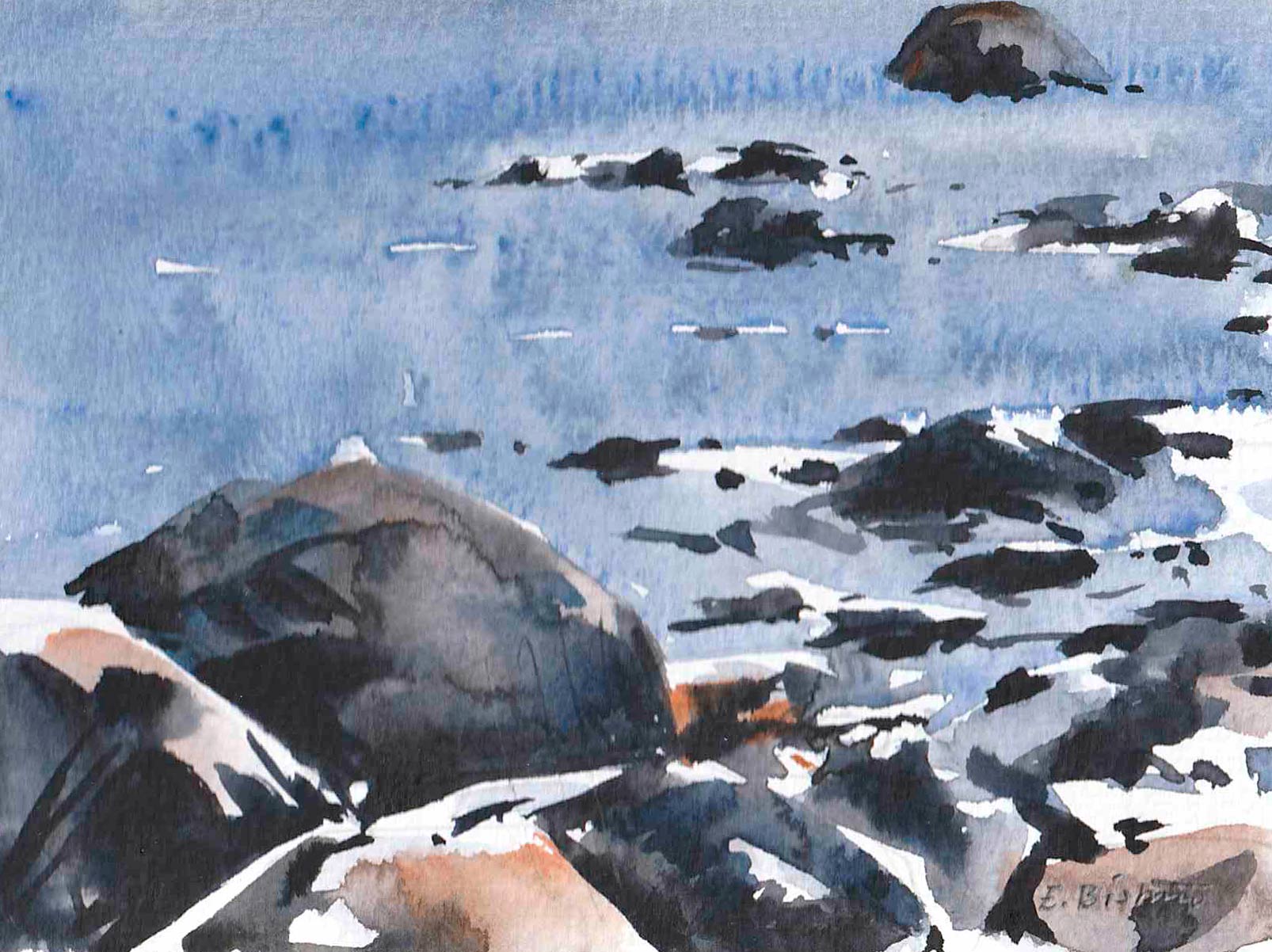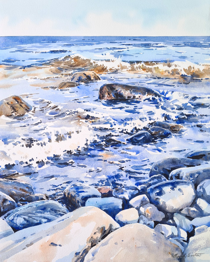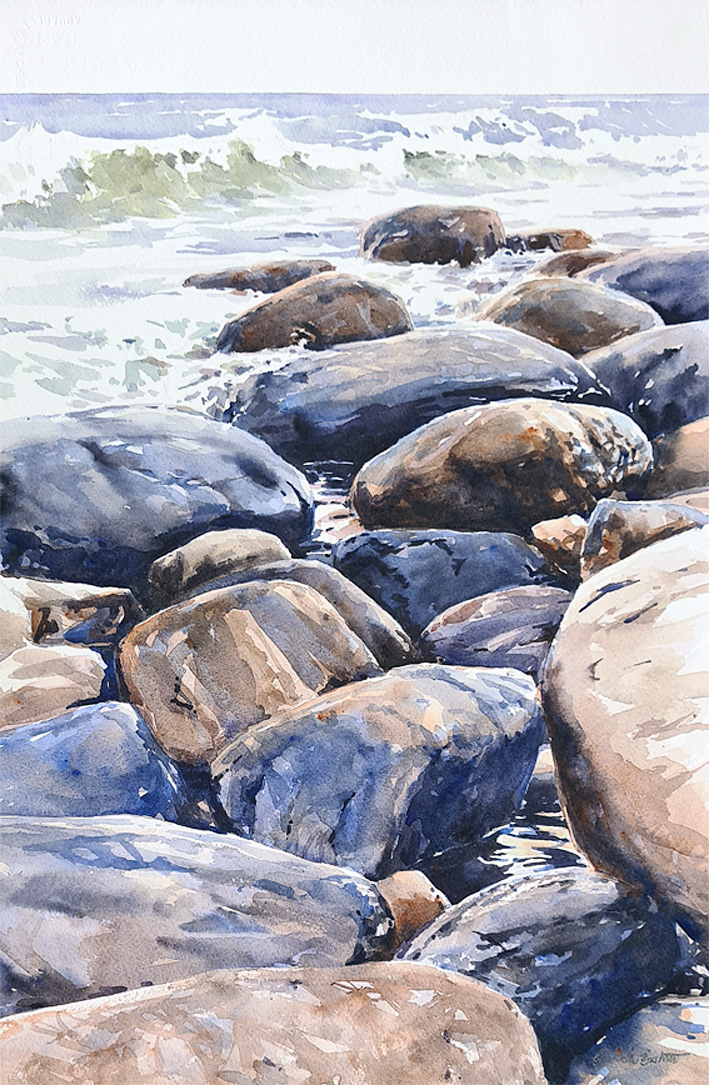 I trettio år har jag målat platsen som den här utställningen handlade om. Jag är en upprepningsmänniska. Läser samma böcker och ser samma filmer om och om igen. Livet är förändring och jag vill inte streta emot. Men att ha en fast punkt i livet, där stenblock och horisont ligger stadigt, känns tryggt.