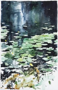 Det är svårt. Jag förstår precis varför det normalt sett inte målas akvareller i formatet en gånger två meter. Men det struntar jag i. Jag har så njutbara morgnar vid Abbortjärn. Jag stiger upp halv sex och åker dit, för att vara först på plats. Så att vattnet ligger stilla.