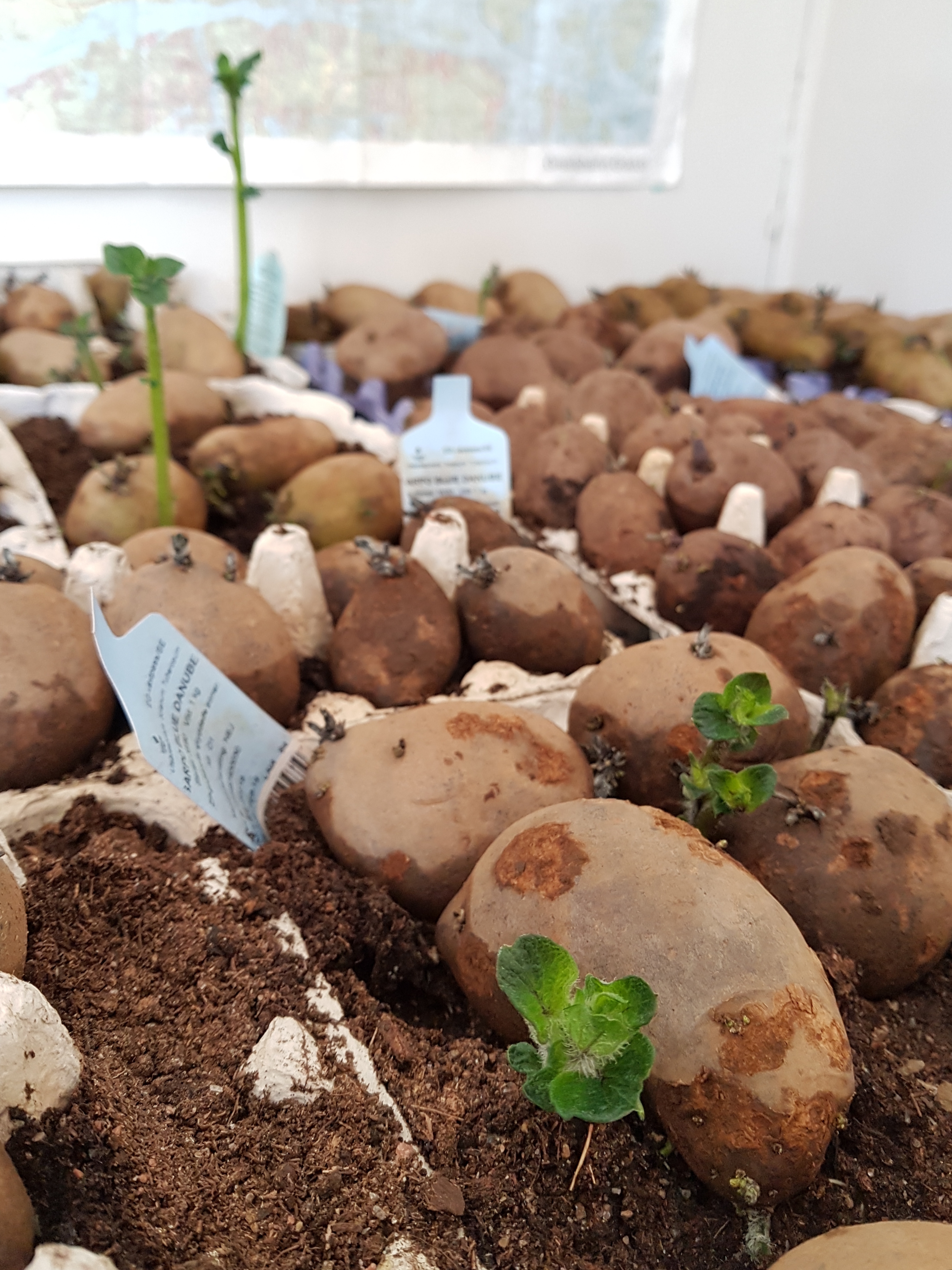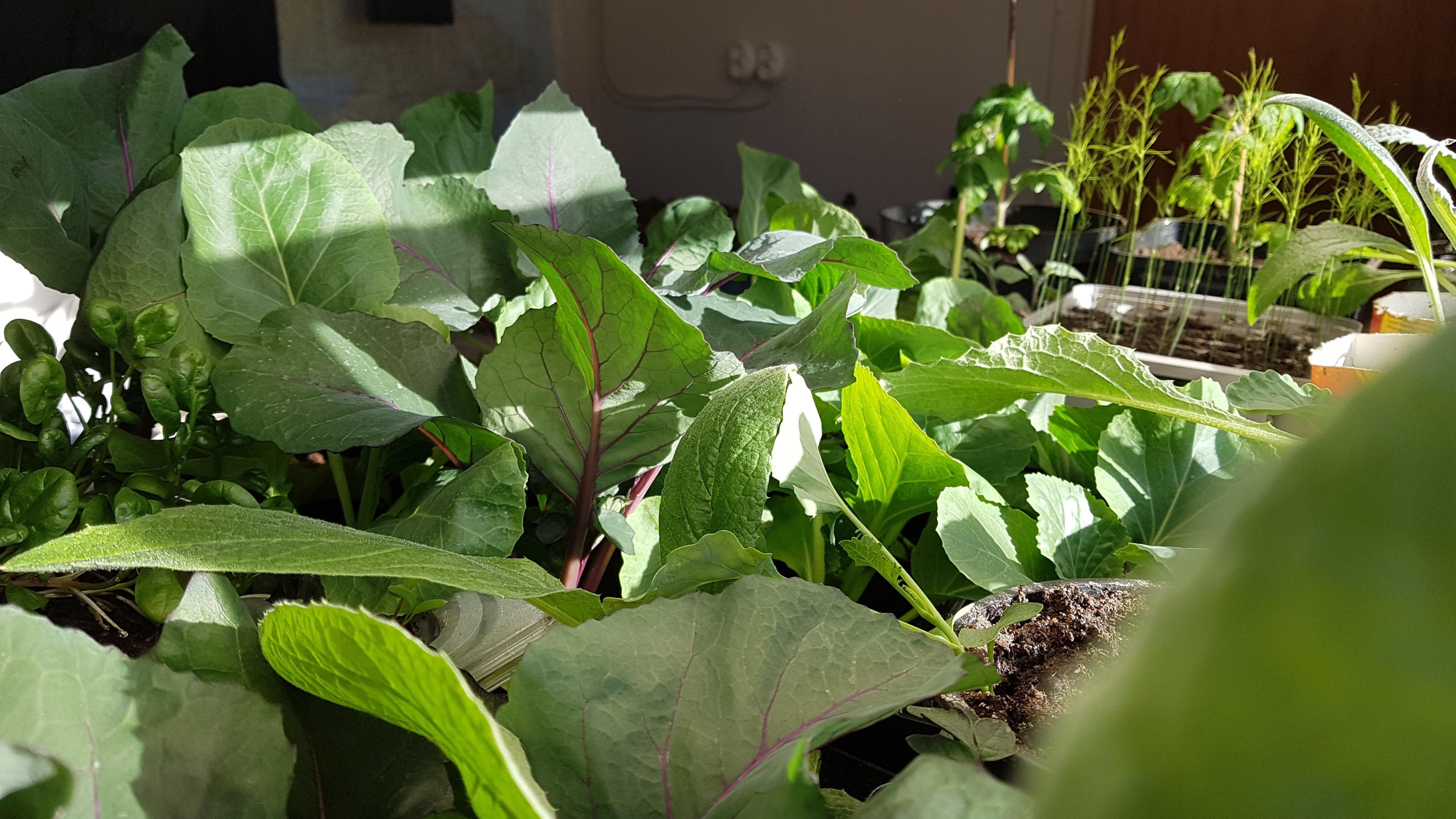 Inomhus är det trångt på sina håll, med plantor som väntar på att få flytta ut. Spetskål, rotselleri, paprika, tomater, lök (mnja, förresten, den ser ut att vara på vippen att dö…), broccoli, rödbetor, gulbetor, kronärtskockor, smultron och ett gäng sommarblommor står på tillväxt.