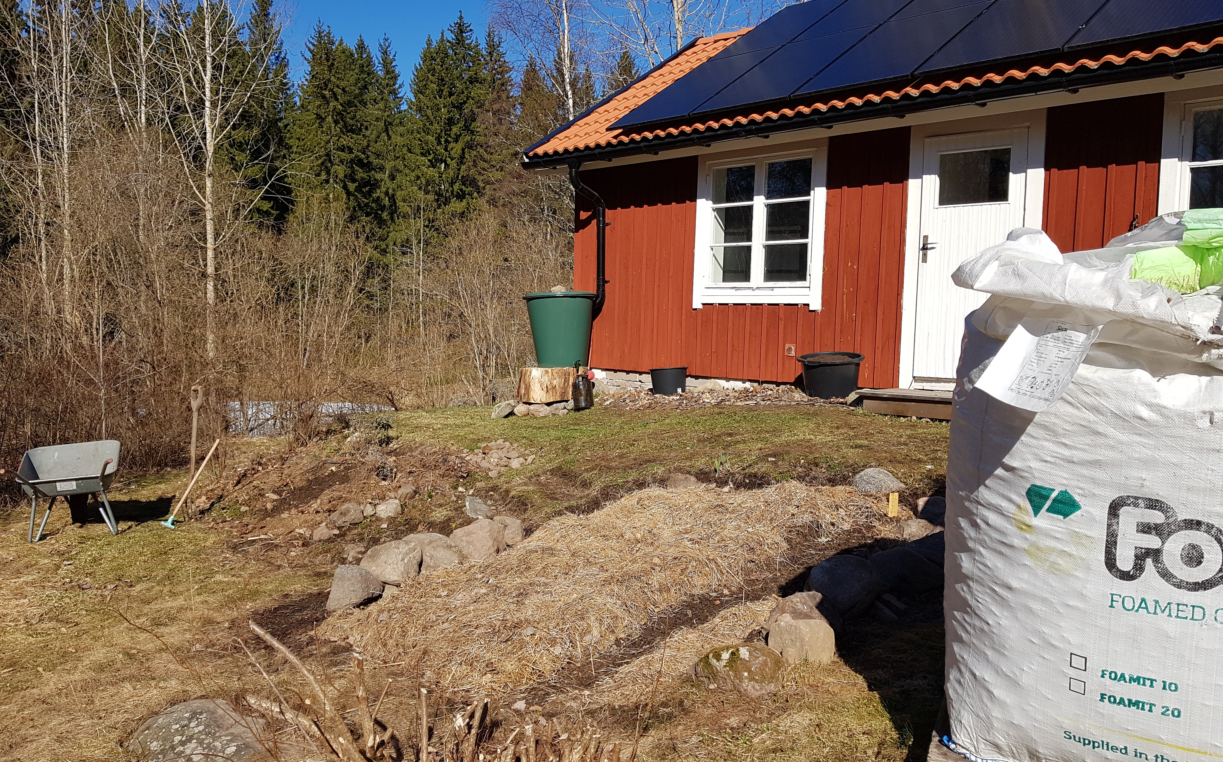 Jag vill inte sprida villfarelsen att allt är snyggt och färdigt här på gården. Utanför uthuset står storsäckar med skumglas och väntar på att skottas upp och få tjänstgöra som golvisolering. Vid väggen har jag förberett byttor för tomatplantering, som står och ser trista och tomma ut. Intill knutarna har vi monterat vattentunnor. Inte vackra, men praktiska. Om sommaren blir torr som i fjol kommer de vara alldeles nödvändiga.