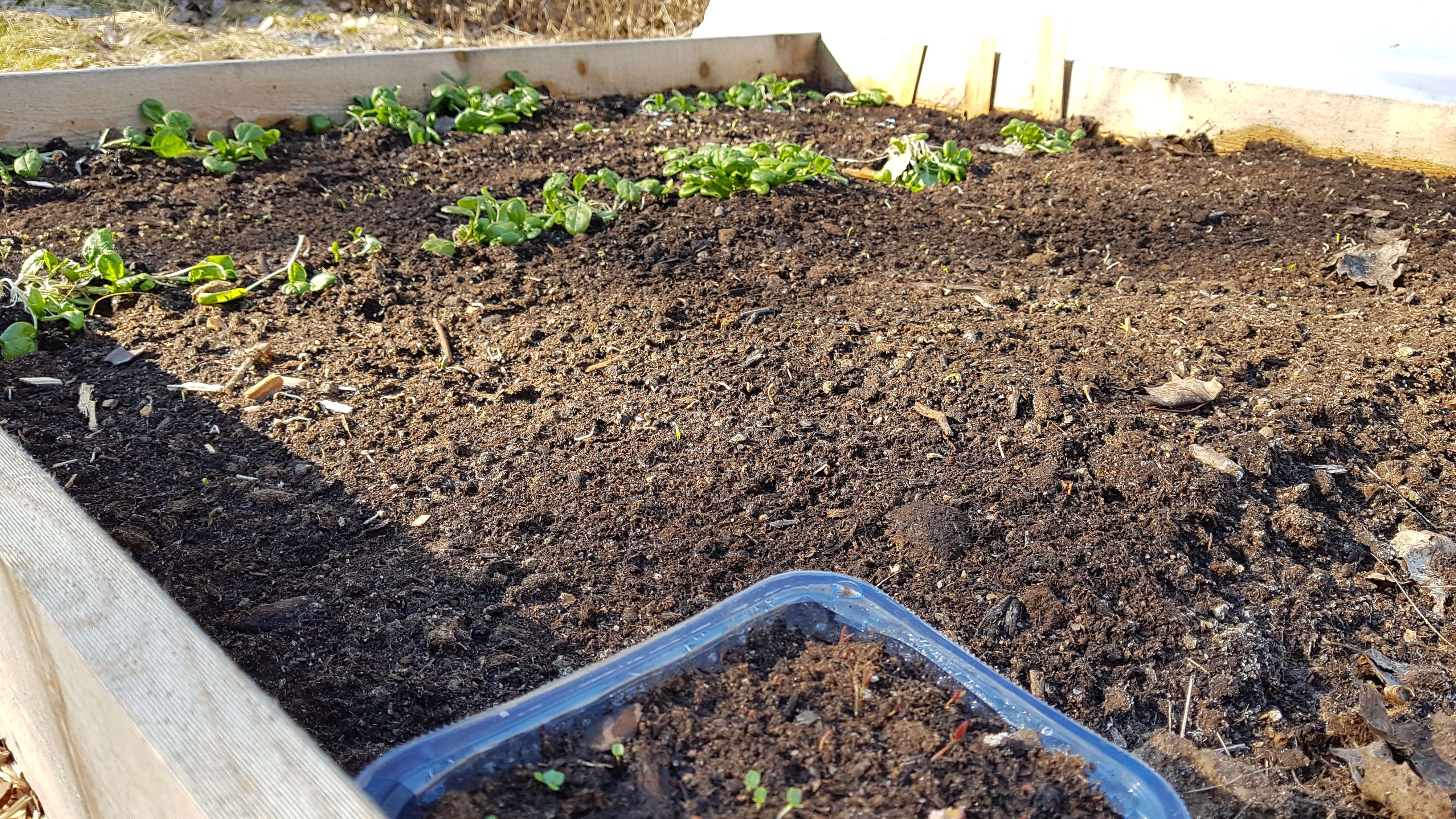 I mars sådde jag till exempel den här bädden med spenat, ruccola, rödbetor och ringblommor och planterade ut spenat som jag hade förkultiverat i vår kalla farstu. Jag vattnade och lade på fiberduk. Det blev smällkallt och har kommit både regn, hagel och snö, men jag oroar mig inte för sådant. Mitt mål i år är att se vad som växer här, i odlingszon 3/4. Få en känsla för när och hur man kan så och plantera. Spenat går tydligen bra i mars, i alla fall. Bra att veta.